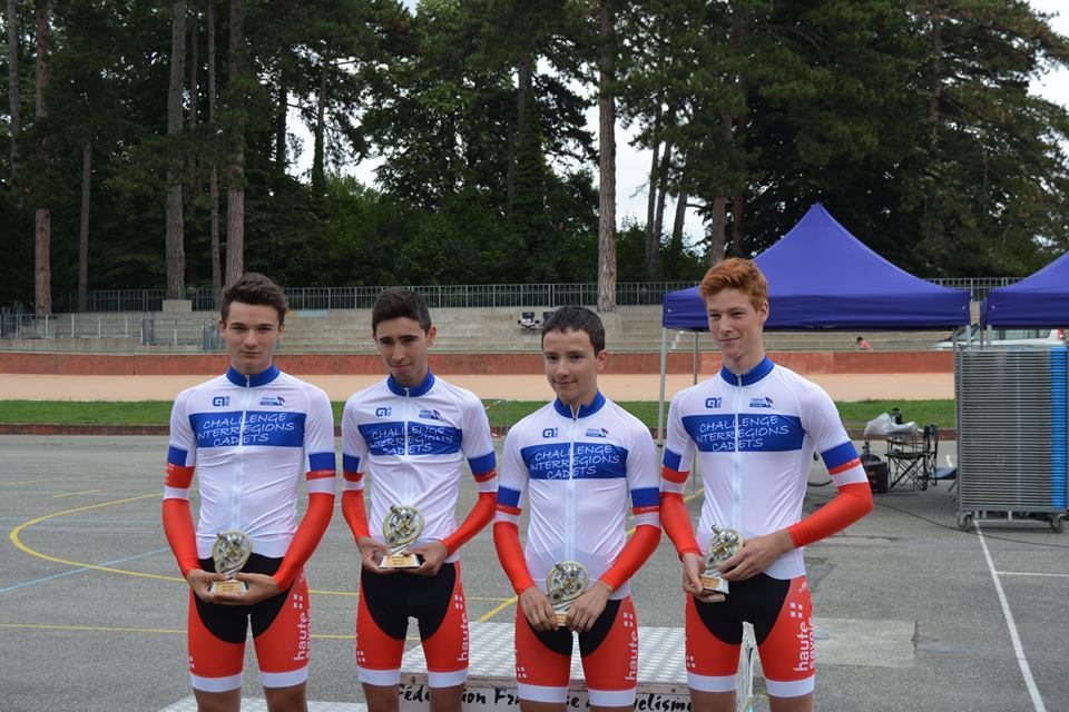 - Inter Région Piste Cadets - Lyon, samedi 1er juillet: La Haute-Savoie termine à une très belle 2ème place au classement général après avoir magnifiquement remporté la poursuite par équipe. Ce beau résultat leur permet de terminer 2ème de l'Inter-régions Cadets Sud-Est. Ils participeront aux deux finales route et piste en Septembre. A noter que Joran SERMONET a participé à cette manche sous les couleurs de l'Ain car il a remplacé un de leur coureur tombé à l'échauffement.